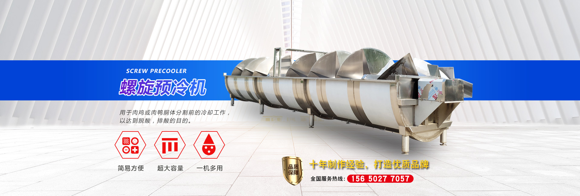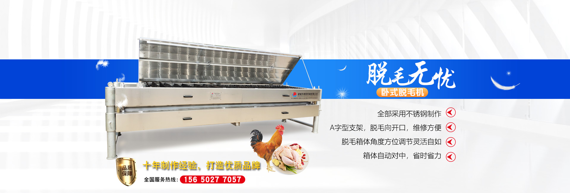 公司長期與國內(nèi)外屠宰加工企業(yè)合作,走引進(jìn)——消化——創(chuàng)新和自主研發(fā)相結(jié)合的道路,在國內(nèi)外同類產(chǎn)品的基礎(chǔ)上,不斷更新和改造。公司主要設(shè)備有:A字型立式脫毛機(jī)、臥式脫毛機(jī)、強(qiáng)力噴淋機(jī)、松毛機(jī)、浸燙池、螺旋預(yù)冷機(jī)、禽籠清洗機(jī)、電暈機(jī)、兔扯皮機(jī)、兔割前爪/后爪機(jī)、剝胗機(jī)、自動洗鉤機(jī)、螺旋燙爪機(jī)、雞爪脫皮機(jī)、分割輸送帶等屠宰用設(shè)備。其中,公司獨力發(fā)明生產(chǎn)設(shè)計的“電動調(diào)節(jié)脫毛機(jī)”及“自動控水控溫浸燙池”順利通過知識產(chǎn)權(quán)局的實質(zhì)性審查。公司所生產(chǎn)的設(shè)備 可與國外同類產(chǎn)品配套使用,設(shè)備遠(yuǎn)銷阿爾及利亞、澳大利亞等中東、非州等并建立了長期穩(wěn)定的合作關(guān)系。